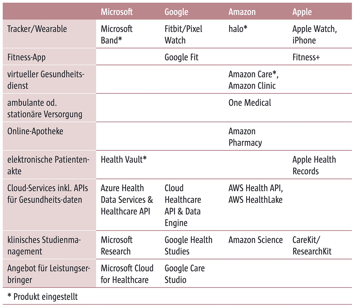 Apple: Im Vergleich zu Google ist Apple mit seinen Angeboten im Gesundheitswesen wesentlich weniger breit aufgestellt. Aber auch Apple-CEO Tim Cook konstatierte bereits 2019, dass der größte Beitrag Apples für die Menschheit im Bereich Gesundheit liegen wird (CNBC 2019). Zum einen fokussiert sich Apple auf persönliche Gesundheits- und Fitnessfunktionen, wie etwa mit der Apple Watch und der elektronischen Patientenakte Apple Health Records. Zum anderen unterstützt Apple die medizinische Forschung und Pflege mit Softwareangeboten wie Research– und CareKit und dem Zugang zu medizinischen Daten von potenziell über einer Milliarde iPhone-Nutzerinnen und -Nutzern.